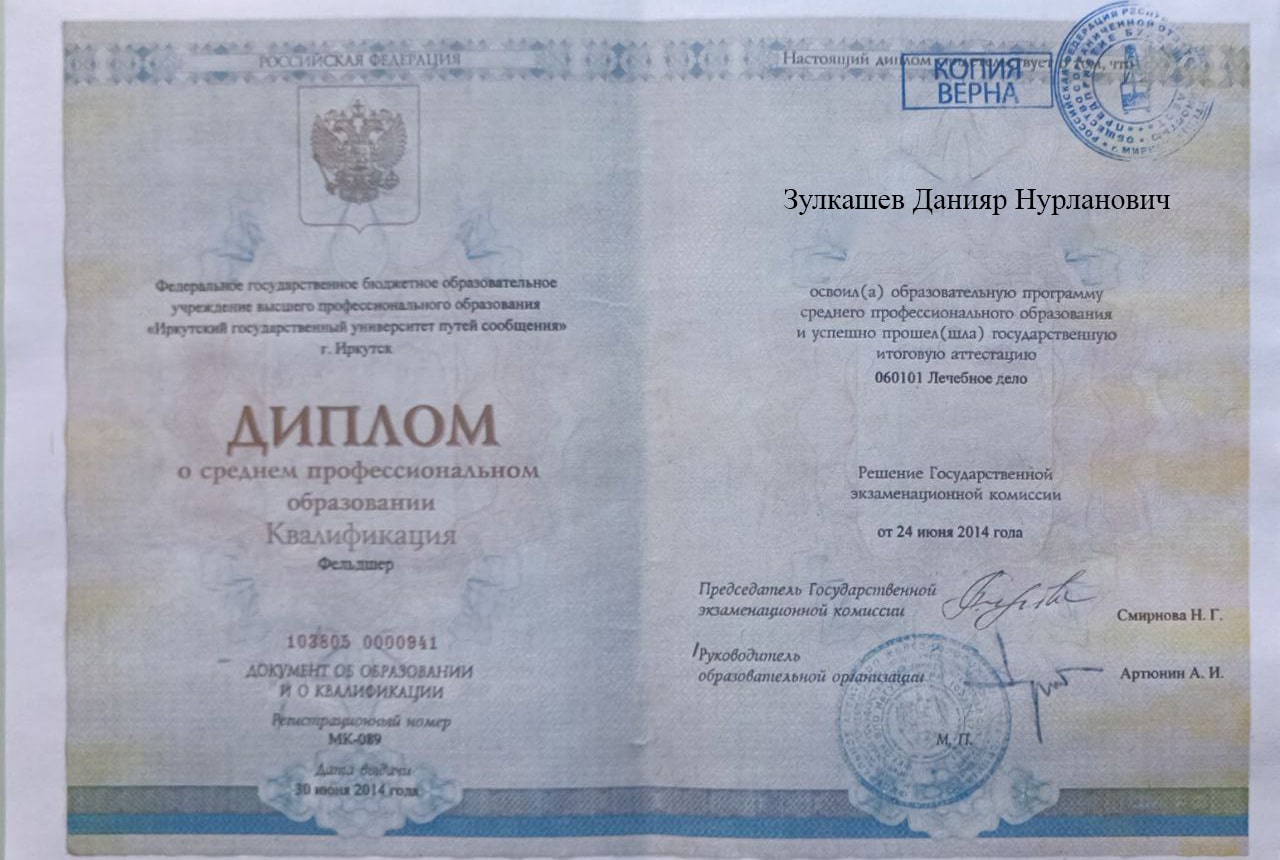 Меня зовут Зулкашев Данияр Нурланович, я — фельдшер выездной наркологической бригады в наркологической клинике "Плюс" в Ахтах. Я стремлюсь помогать людям, оказывая квалифицированную медицинскую помощь в самых разных ситуациях, и верю, что каждый пациент заслуживает внимания и поддержки на пути к выздоровлению.